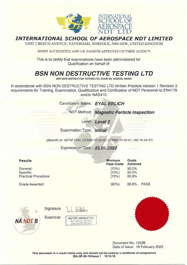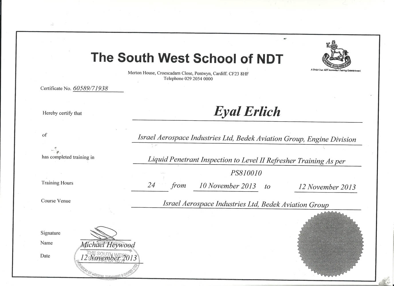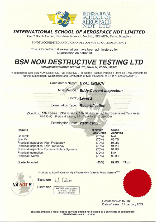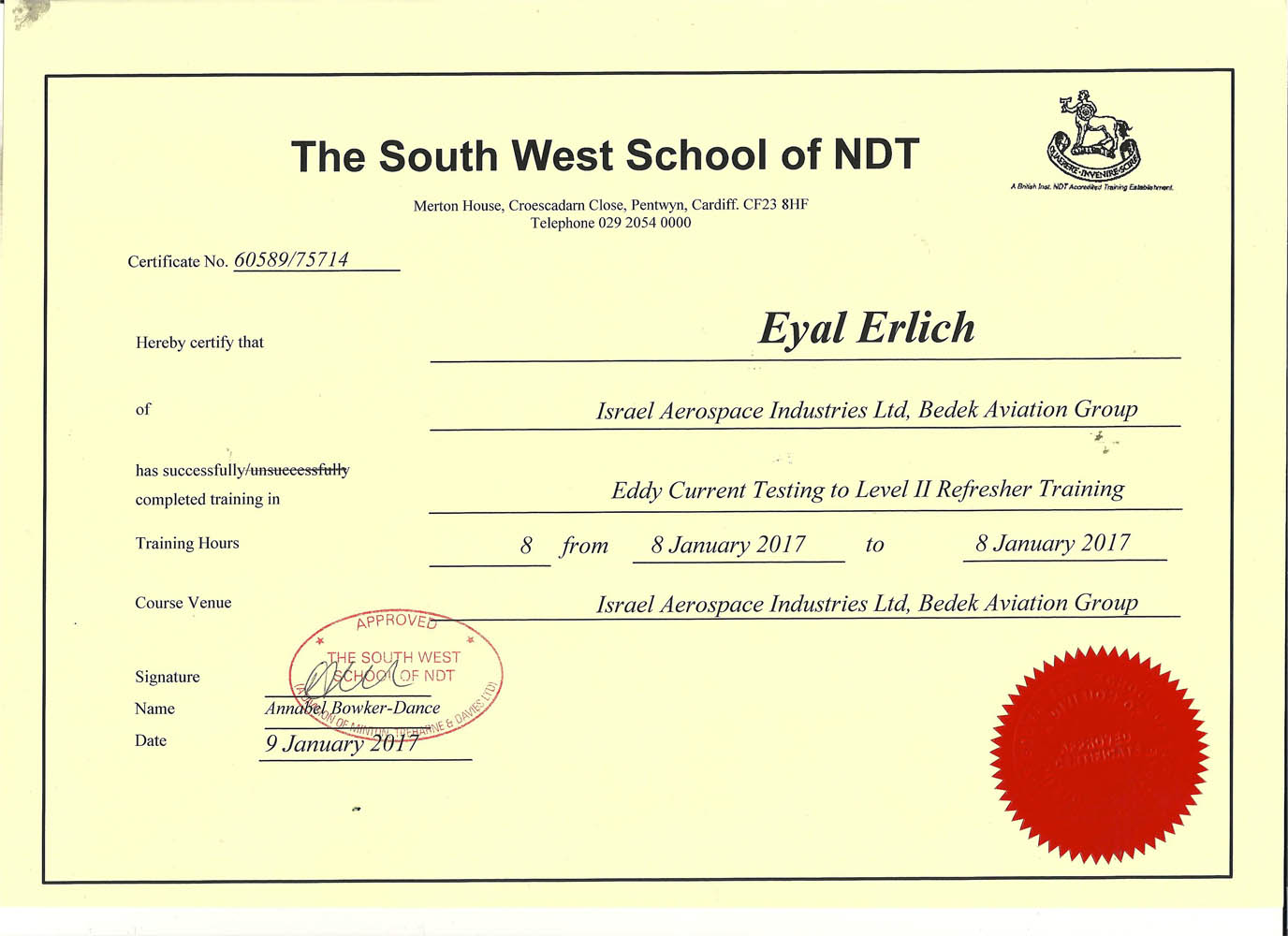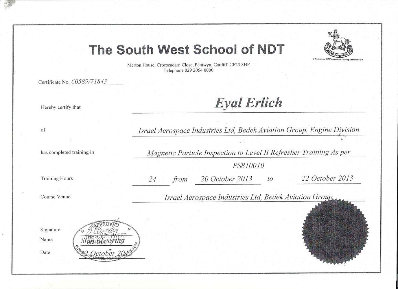 תעודת הסמכה - The South West School of NDT